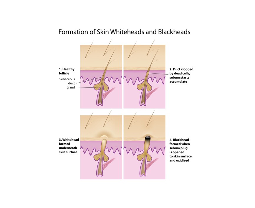 Các “nút” đó được gọi là mụn trứng cá. Mụn đầu đen được gọi là mụn trứng cá “mở” trong khi đó mụn đầu trắng được gọi là mụn trứng cá “đóng”. Cũng chính vì lí do “mở” nên mụn đầu đen bị đen là do các bã nhờn bị oxy hoá bởi không khí.