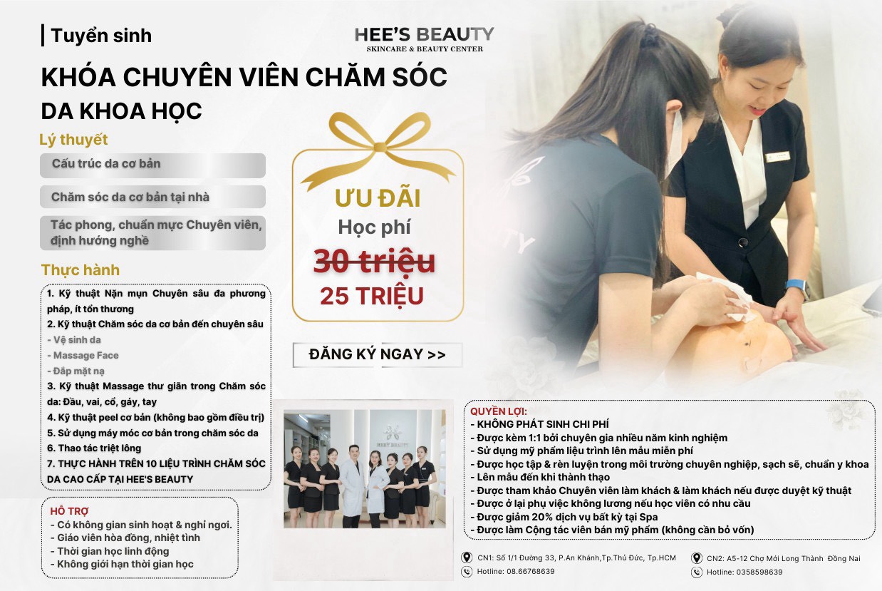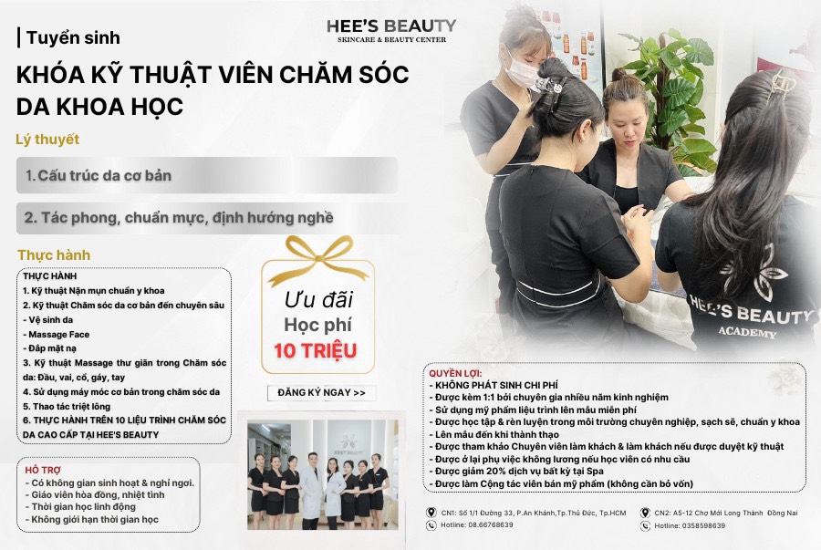 Hee’s Beauty tại Long Thành là điểm đến hàng đầu cho việc học nghề spa chuyên nghiệp. Với các cơ sở tại Hồ Chí Minh và Long Thành, không chỉ cung cấp nội dung học sâu, đa dạng mà còn có mức học phí phù hợp, dễ tiếp cận với mọi đối tượng học viên. Bạn có thể yên tâm rằng việc học tại Hee’s Beauty sẽ mang lại cho bạn kiến thức và kỹ năng cần thiết để thành công trong ngành spa.