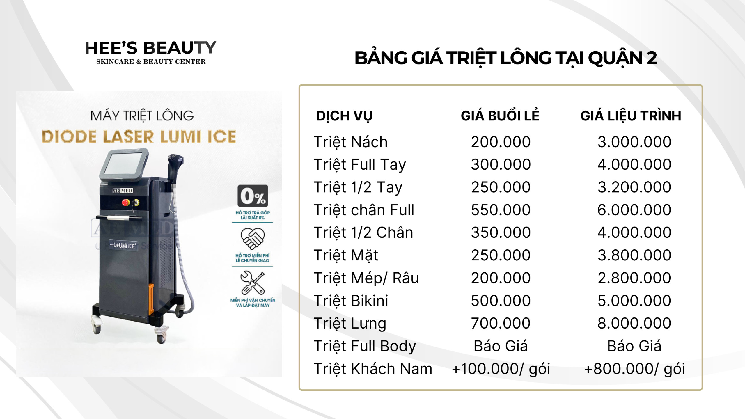 BẢNG GIÁ TRIỆT LÔNG TẠI HEE’S BEAUTY QUẬN 2 NĂM 2024